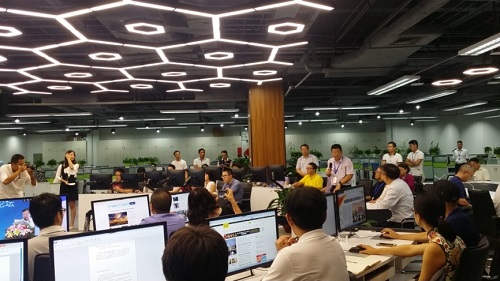 在這場全國晚報業的盛典之后,參加本次全國晚協年會的嘉賓們一同參觀了羊城晚報全媒體采編指揮中心(即“中央廚房”)。作為羊晚報業集團在推動媒體深度融合過程的一項代表性成果,羊城晚報的“中央廚房”獲得了報社社長劉海陵的高度評價與重點推薦,同時,由報社精心策劃、剪輯的一則關于“中央廚房”全面介紹的宣傳大片,也在這次參觀交流會上震撼播出,并收獲媒體同行的肯定與認同。